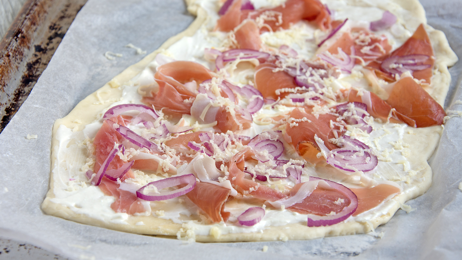Flammkuchenbden darauflegen mit Kruterschmand bestreichen. Whrend der Teig vor sich hin geht den Speck in feine Wrfel oder Streifen schneiden. Flammkuchenteig ausrollen und mit dem Papier auf ein Blech legen mit Creme fraiche bestreichen mit Prosciutto Zwiebel und Kse belegen.